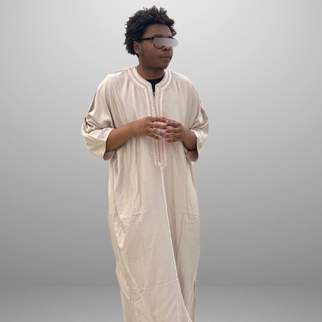 The Gandoura features a relaxed, ankle-length silhouette following the sunnah, with short or long sleeves and is adorned with subtle embroidery along the neckline and chest. Inspired by Moroccan tradition, it blends simplicity with sophistication.ideal for warm climates, religious gatherings, or cultural celebrations.